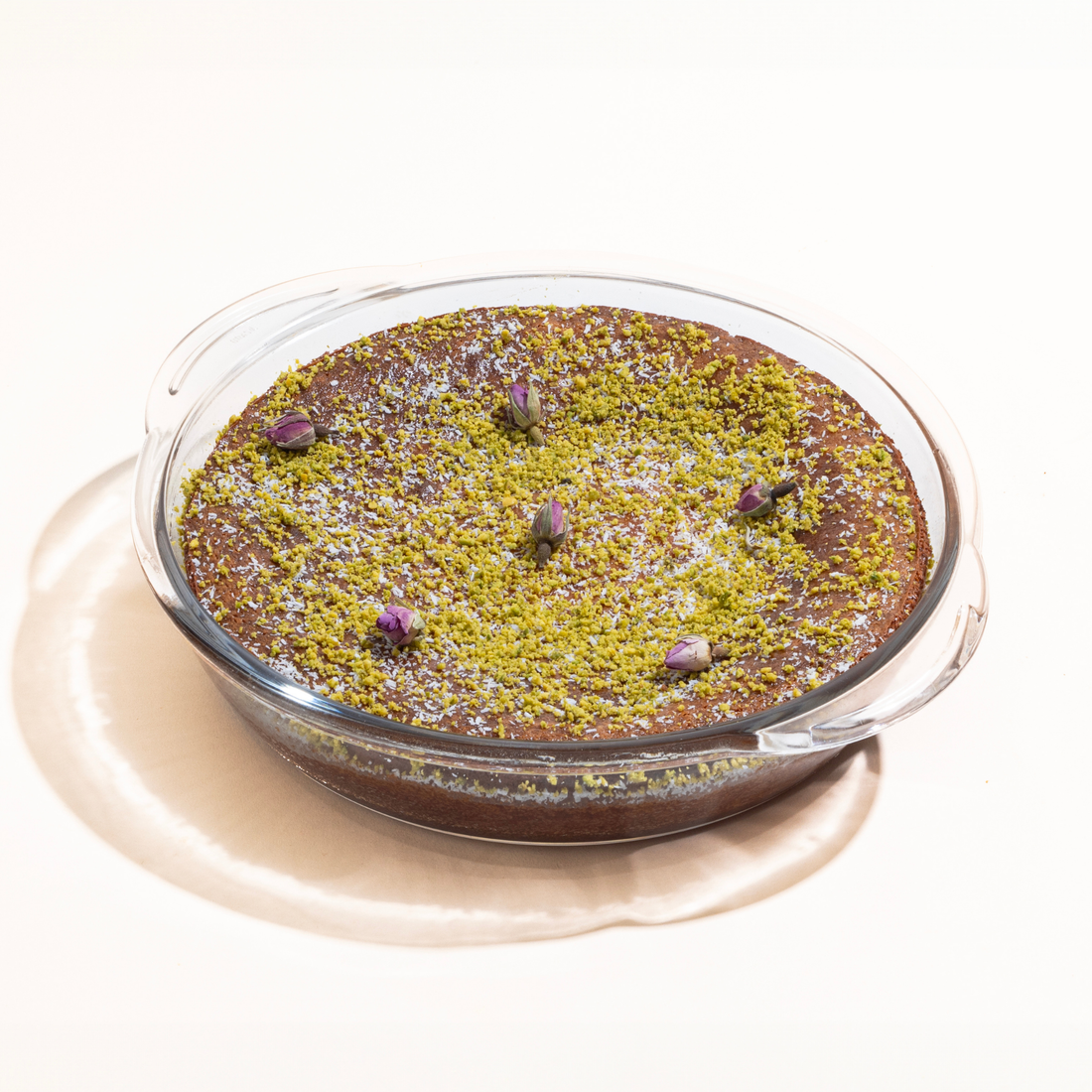 بسبوسة ناعمة محشوة بالقشطة ومزينة بالفستق وبتلات الورد